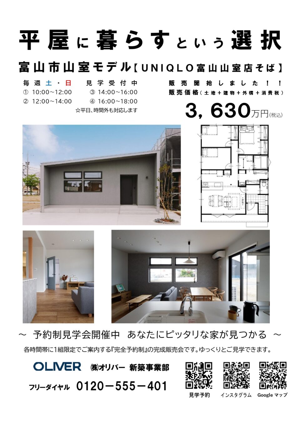 富山市山室にあるOLIVER建築設計の平屋のモデルハウス『ヒラタス』です。