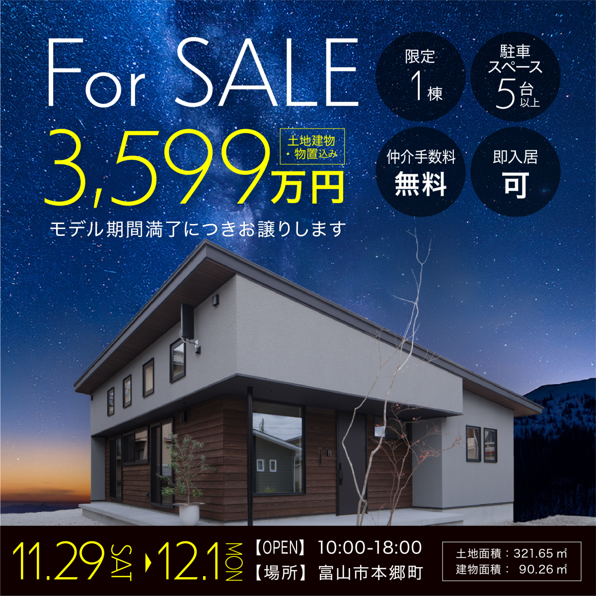 横広にしたスタイルと長い片流れ屋根が与えるイメージは、重厚感と美しさ。 壁の凹凸感と杉板の落着いた組合せが上品な印象を持たせ、大きな窓が解放感を演出します。