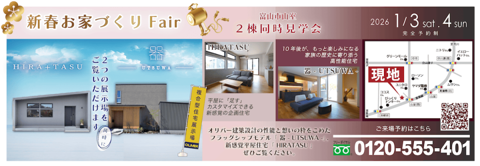 誠に勝手ながら、2025年12月28日(土)〜2026年1月7日(水) は休業させていただきます。 ただし、新年 1月3日(土)・4日(日)は特別営業! 富山市山室ミニ展示場にて3つの新春イベントを同時開催いたします。 🎍 新春イベント開催(1/3・4) 🏡【富山市山室】人気平屋 HIRATASU モデルハウスお譲りします|完成見学会 🏡【富山市山室】 NEW OPEN ! オリバー建築設計 フラッグシップモデル 器 ー UTSUWA ー 🏡【富山市山室】2棟同時 新春お家づくりFair新しい一年の家づくりを、ぜひこの機会にご体感ください。