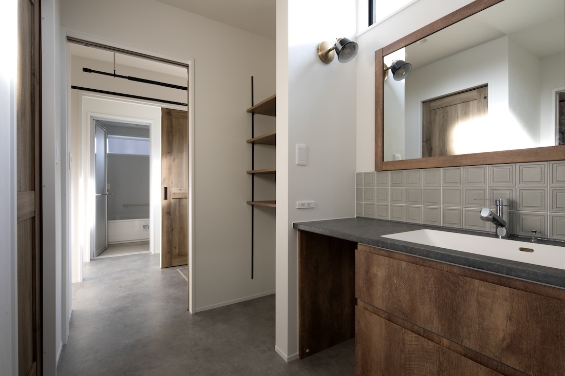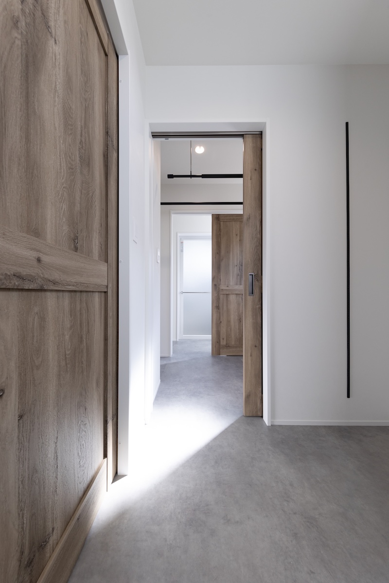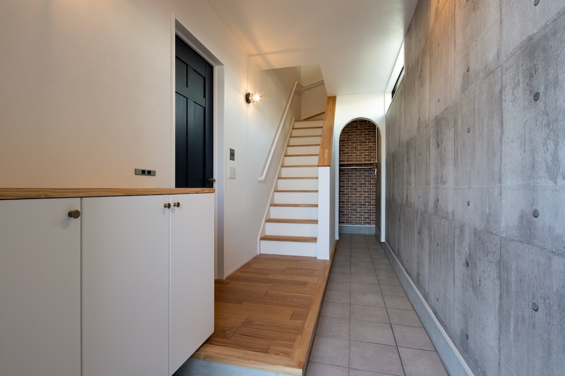 長土間は、当初ご夫妻の希望にはなかったものの、担当者の提案を気に入り採用されました。シューズクローゼットへと続く土間廊下は、コンクリート調の壁がアクセントとなり、インダストリアルな味わいのある空間に。