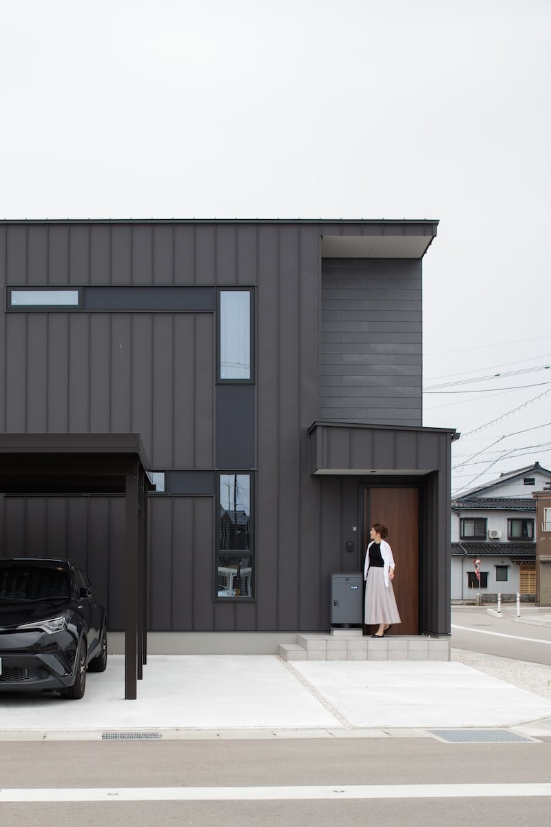 倉庫を思わせる無骨な外観と、玄関から続く長土間が印象的な住まい。