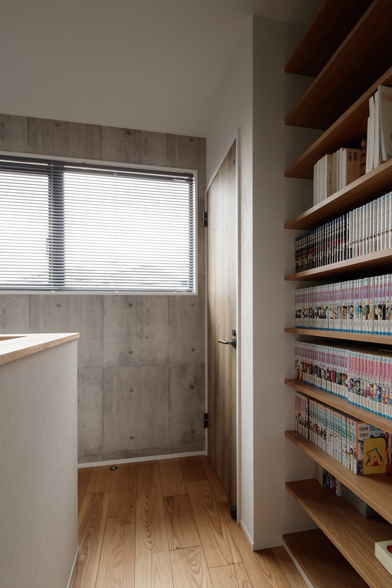 リビングとフリースペースの間の仕切りは引き戸にして、来客時には開放して広々と使える柔軟さも備えています。なお、この引き戸のうち1枚は収納を隠す扉になっており、“収納だと思わずに開けてびっくり!”な遊び心を潜ませました。奥にはご主人の趣味である1000冊以上の漫画が並び、美観と収納を兼ね備えた、ご主人お気に入りのスペースです。